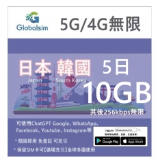 【可選擇eSIM/普通SIM】Globalsim 5G/4G 5地通用 日本,韓國,台灣,..