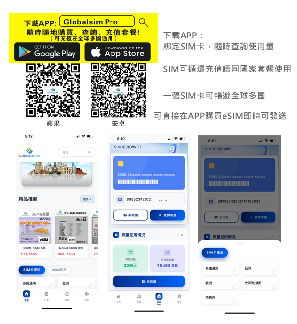 【可選擇eSIM/普通SIM】 Globalsim 5G/4G 亞洲多地+ 歐洲+美國通用 365日5G 10GB 之後降速無限上網卡 數據卡Sim卡 電話咭data 亞洲年卡 歐洲年卡 歐洲上網卡